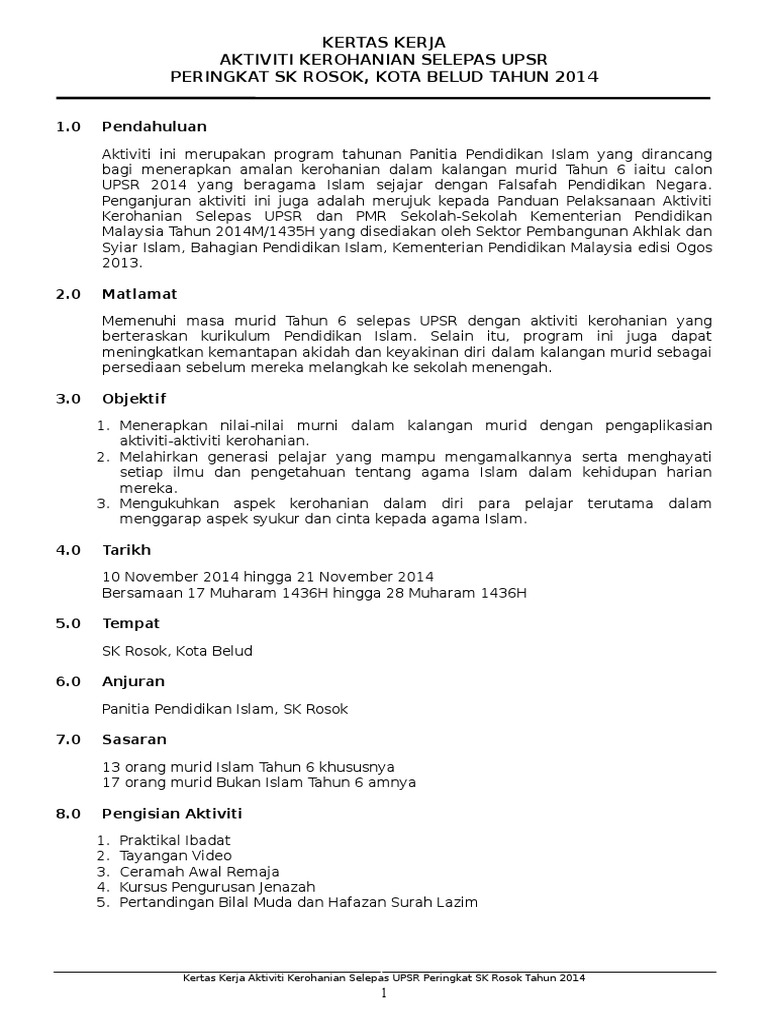 Kertas Kerja Aktiviti Kerohanian Selepas Upsr 2014 Pdf